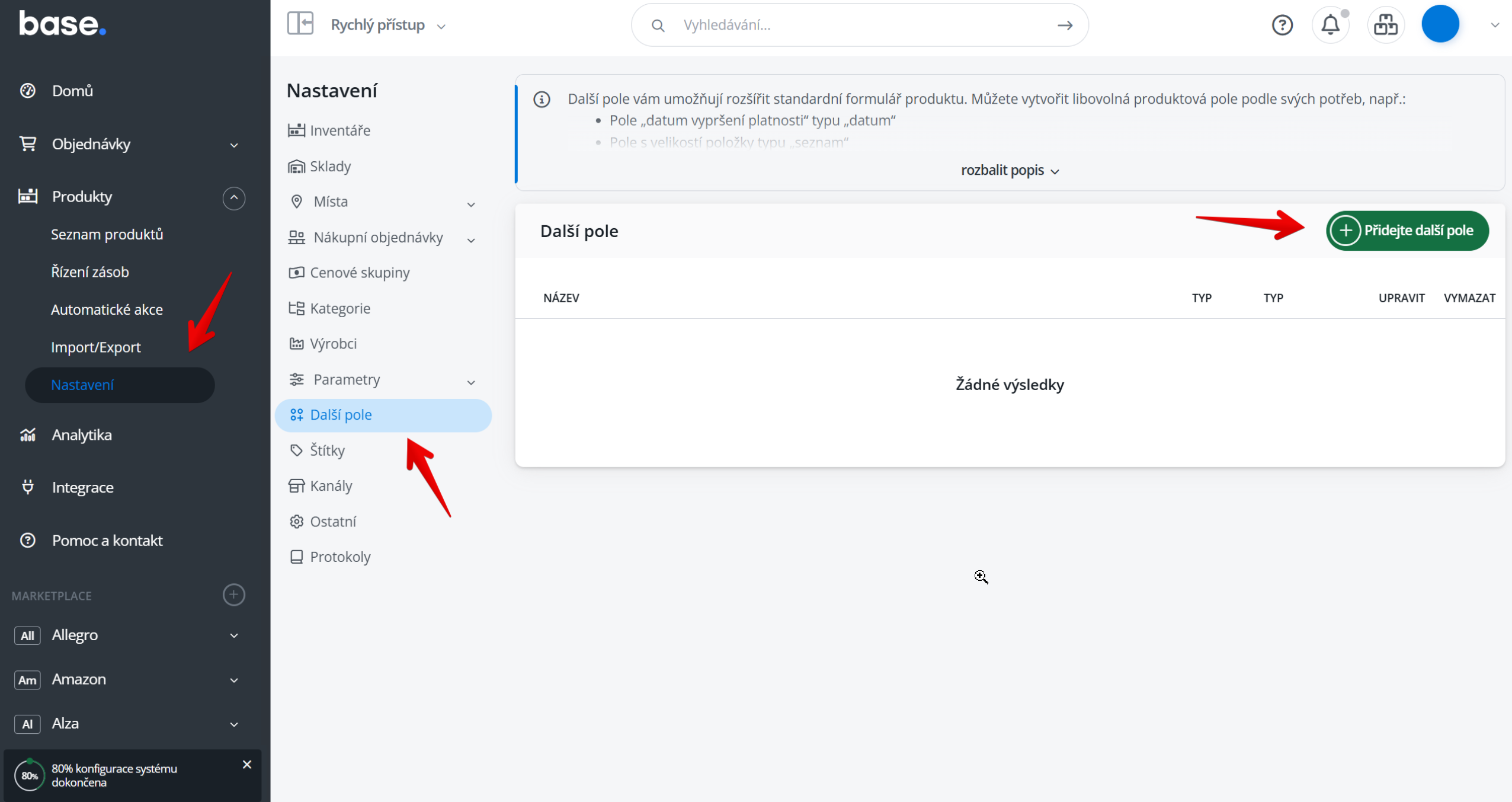 1. Nejprve je potřeba pro toto nastavení vytvořit Další pole typu Číslo v Produkty → Nastavení → Další pole.
