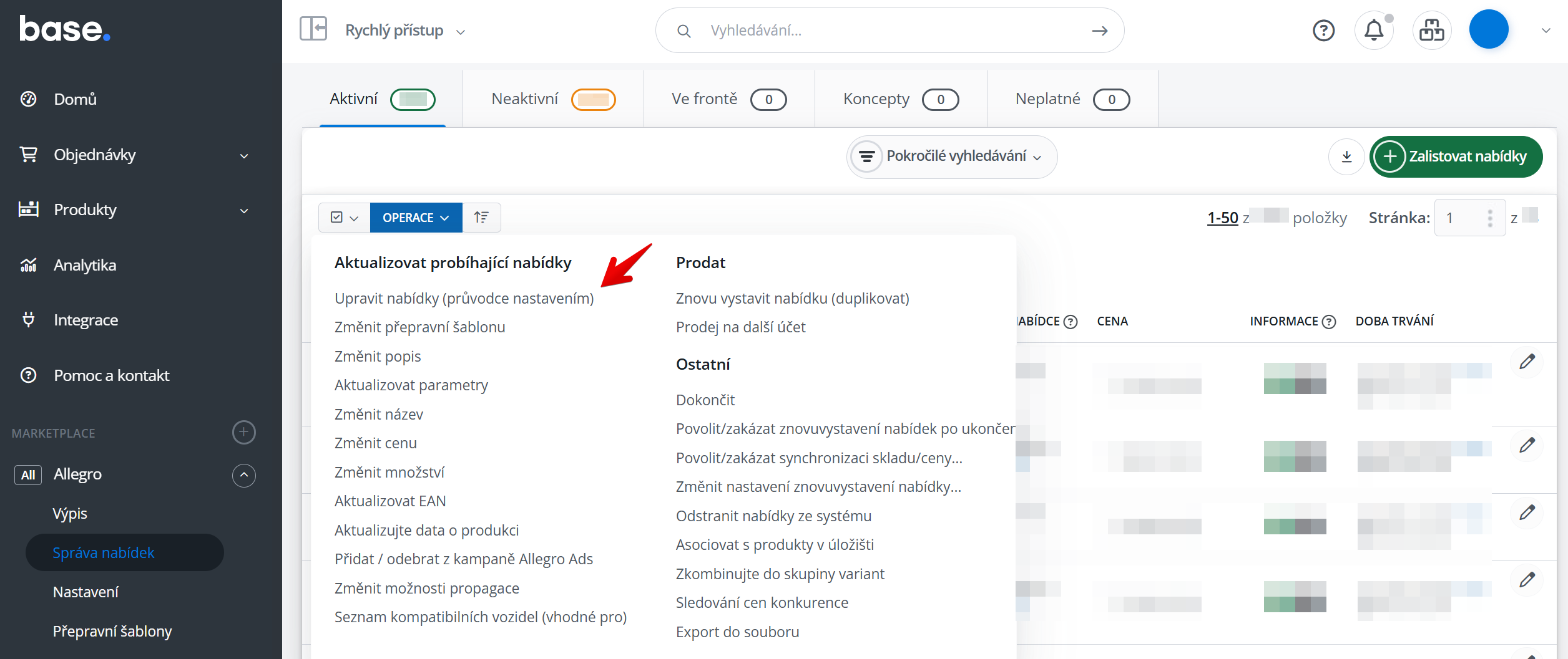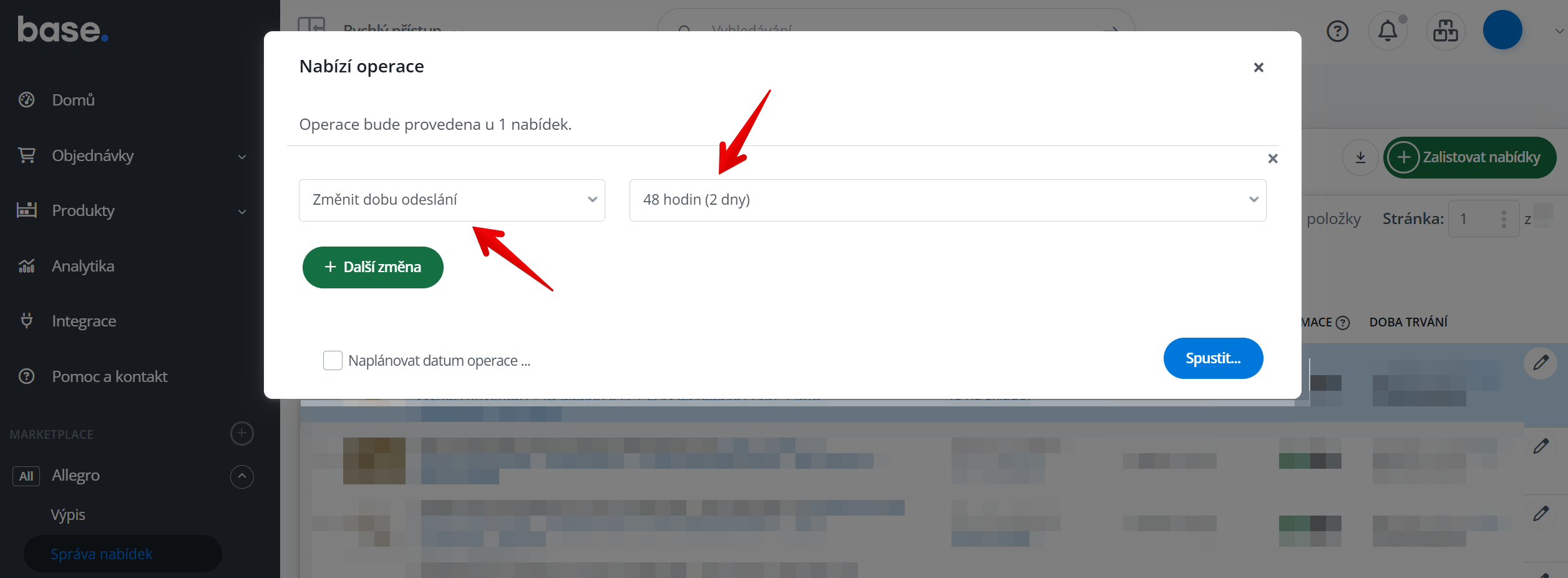 Pokud chcete nastavit stejnou dobu odeslání pro všechny Vaše nové Allegro nabídky, tak je to možné nastavit v nastavení integrace Allegro → Nastavení nabídek → Odeslání během.