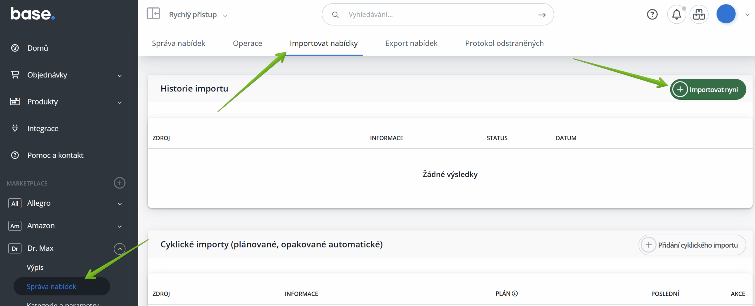 Import nabídek, z platformy Mirakl (Dr. Max) na Base, se využívá v několika situacích. Jejich příkladem může být aktualizace dat v Base, pokud se cokoliv změnilo na straně Mirakl. Dalším příkladem může být aktivace nabídek ze strany Dr. Max, ideální je rovnou provést import nabídek, aby se změna propsala do Base a aktivovala se synchronizace skladového množství a cen.