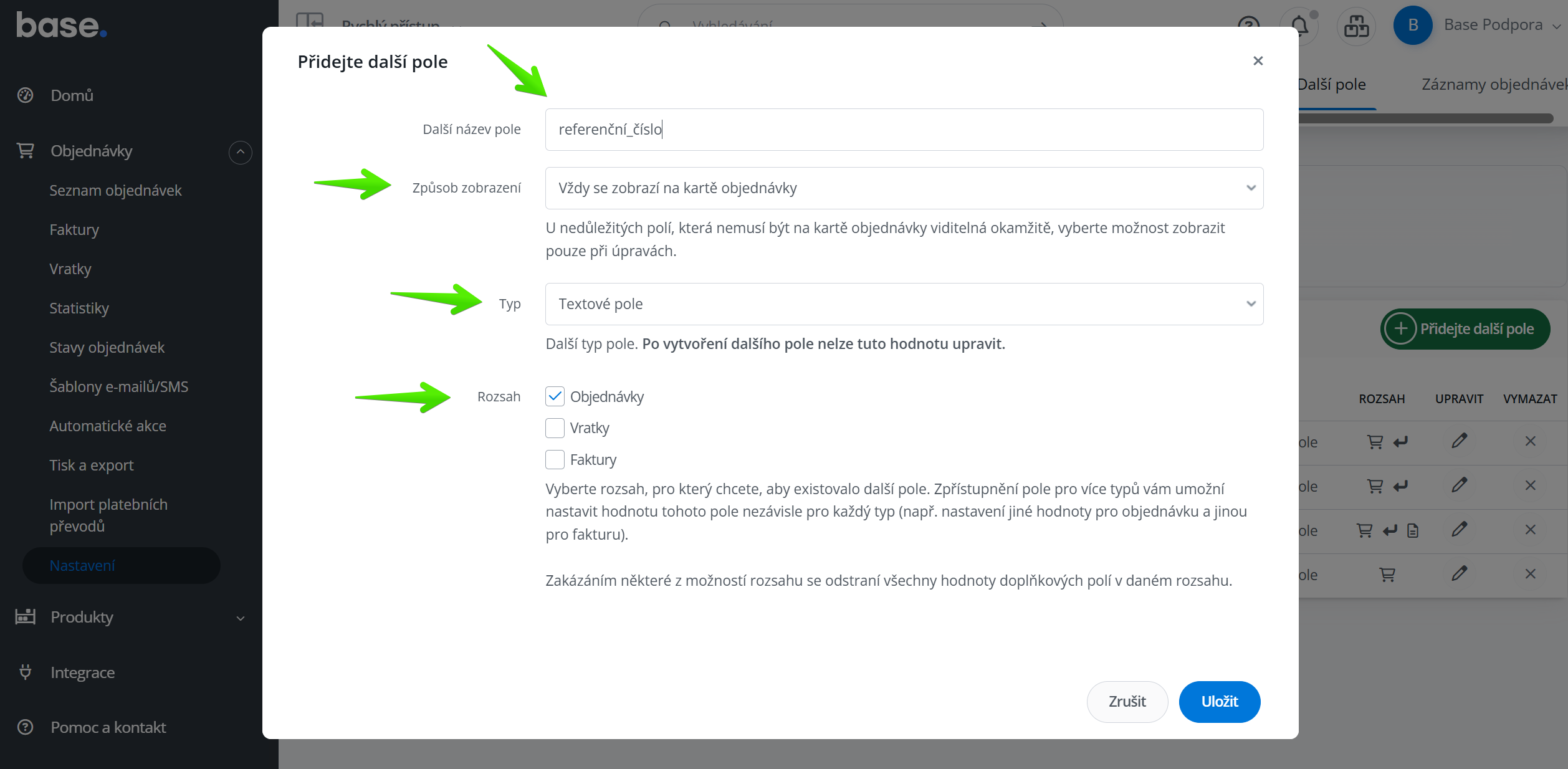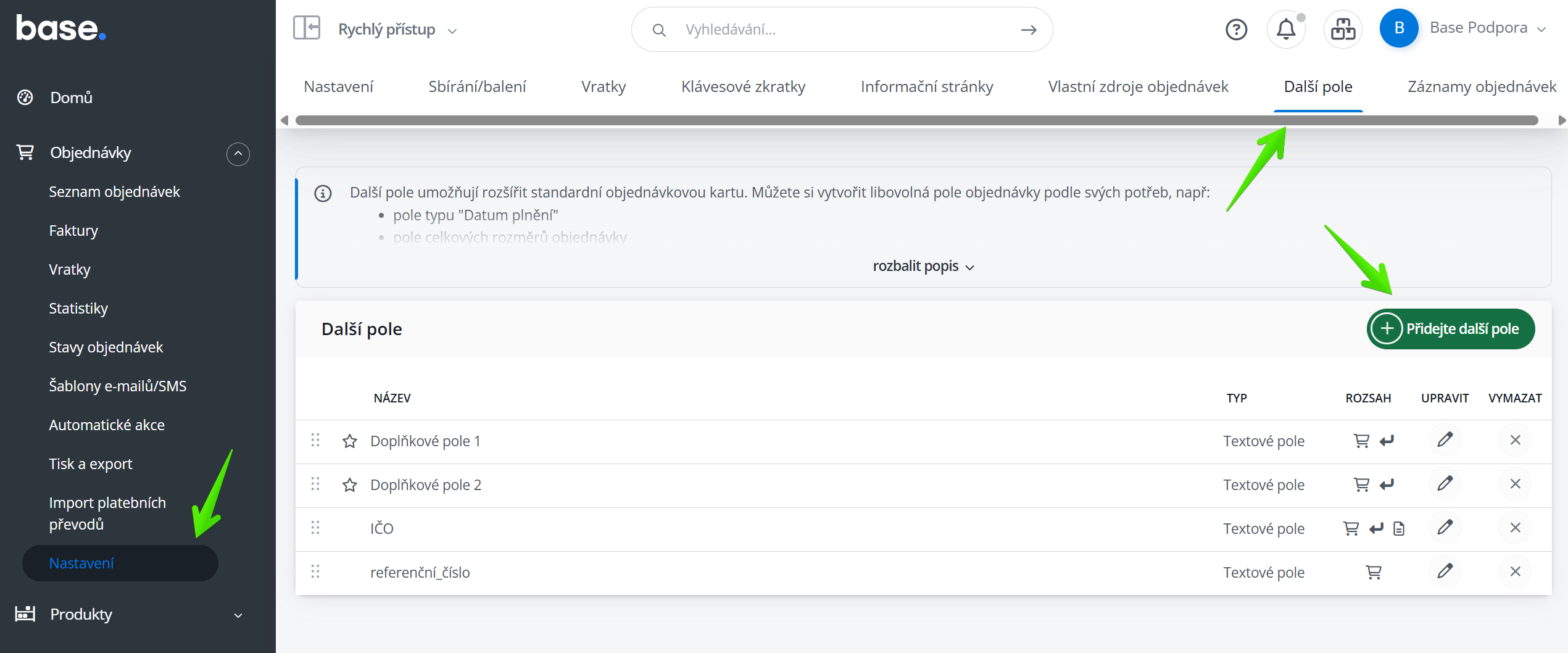 V Objednávky → Nastavení → Další pole → Přidejte další pole.