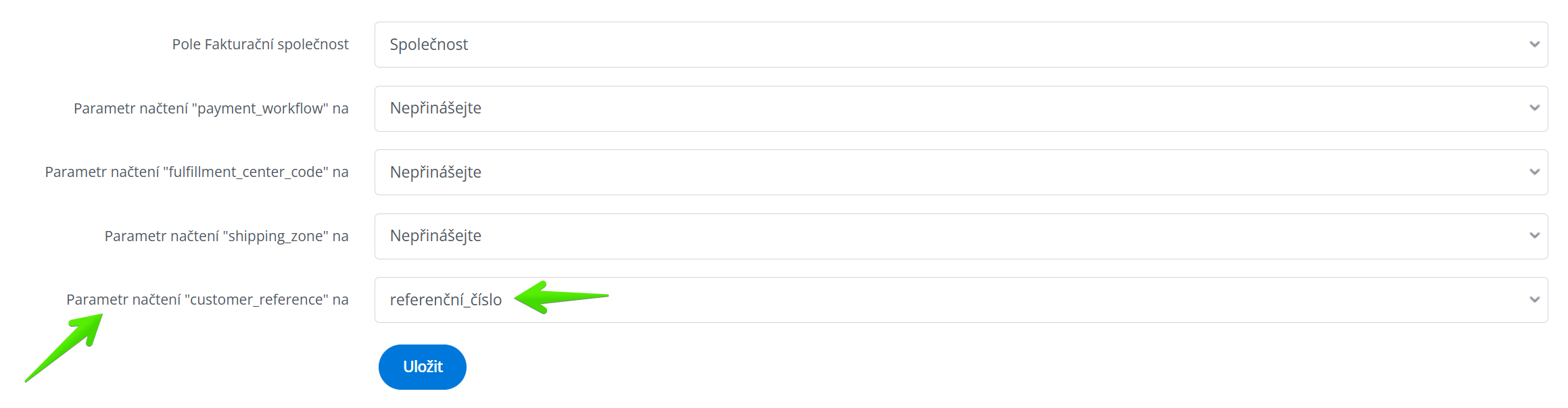 Dr. Max → Objednávky → Parametr načtení „customer_reference“ na → z rozbalovací nabídky vyberte další pole, které chcete použít k tomuto účelu.