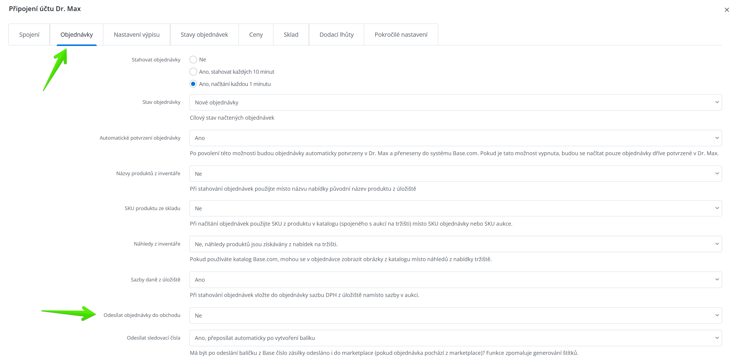 Zapnutí odesílání sledovací čísla na toto marketplace je možné v nastavení integrace Dr. Max → Objednávky → Odesílat sledovací čísla → Ano, přeposílat automaticky po vytvoření balíku (je možné také nastavit přeposílání sledovacího čísla na základě stavu objednávky, ale je potřeba pamatovat na to, že sledovací čísla se v takovém případě přeposílají hromadně několikrát denně, a objednávka musí být v tu dobu v tomto stavu).
