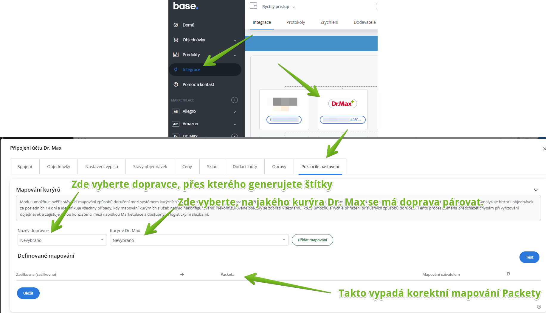 Pro odesílání sledovacího čísla zásilky na marketplace Dr. Max je potřeba zapnout tuto možnost v nastavení integrace a dále nastavit mapování dopravy.