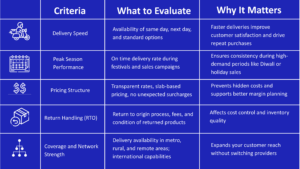 Evaluate delivery speed, pricing transparency, coverage, return handling, and customer support. Look for partners that integrate with your systems and offer scalability. Test their service with trial shipments and check reviews. A right-fit logistics partner should improve efficiency, enhance customer experience, and support your business growth.