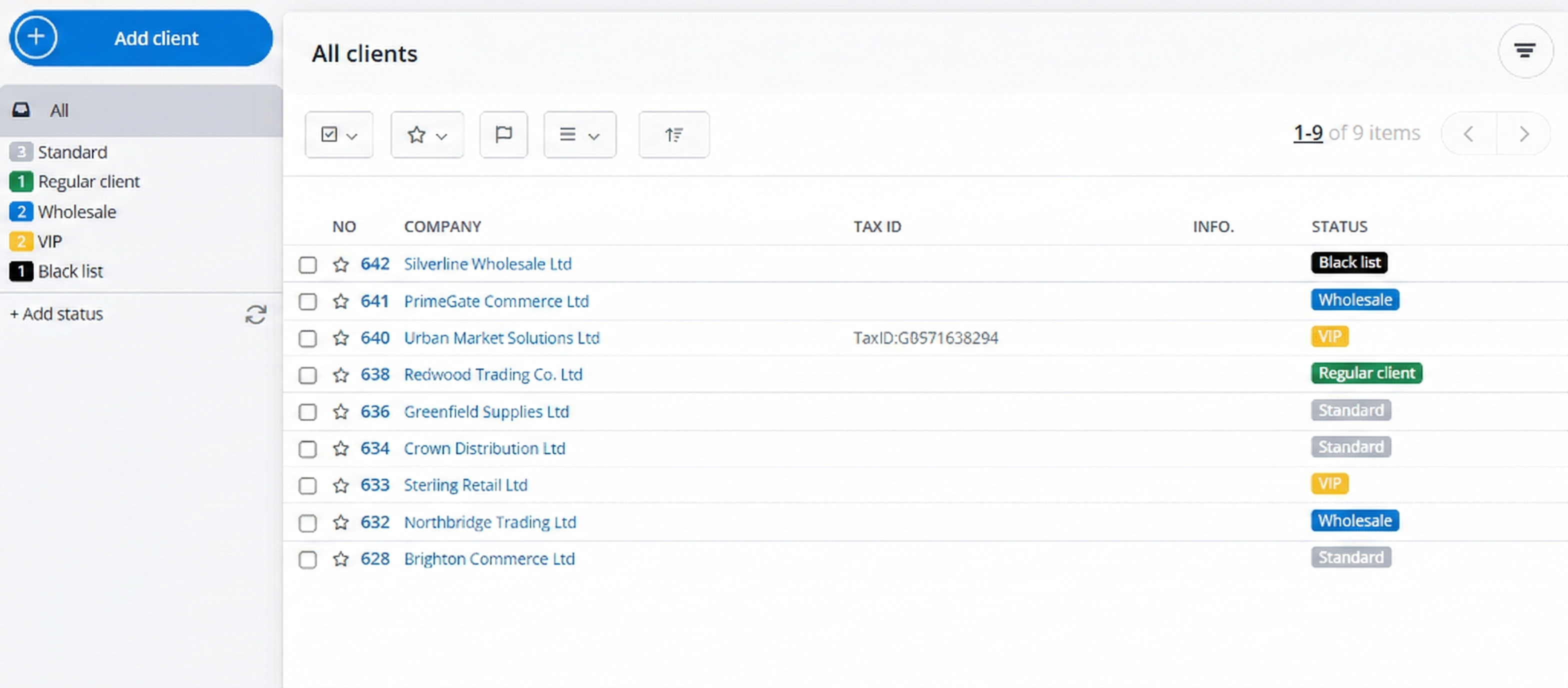• Customers can be organised using statuses and star markers, making B2B relationship management easier.
