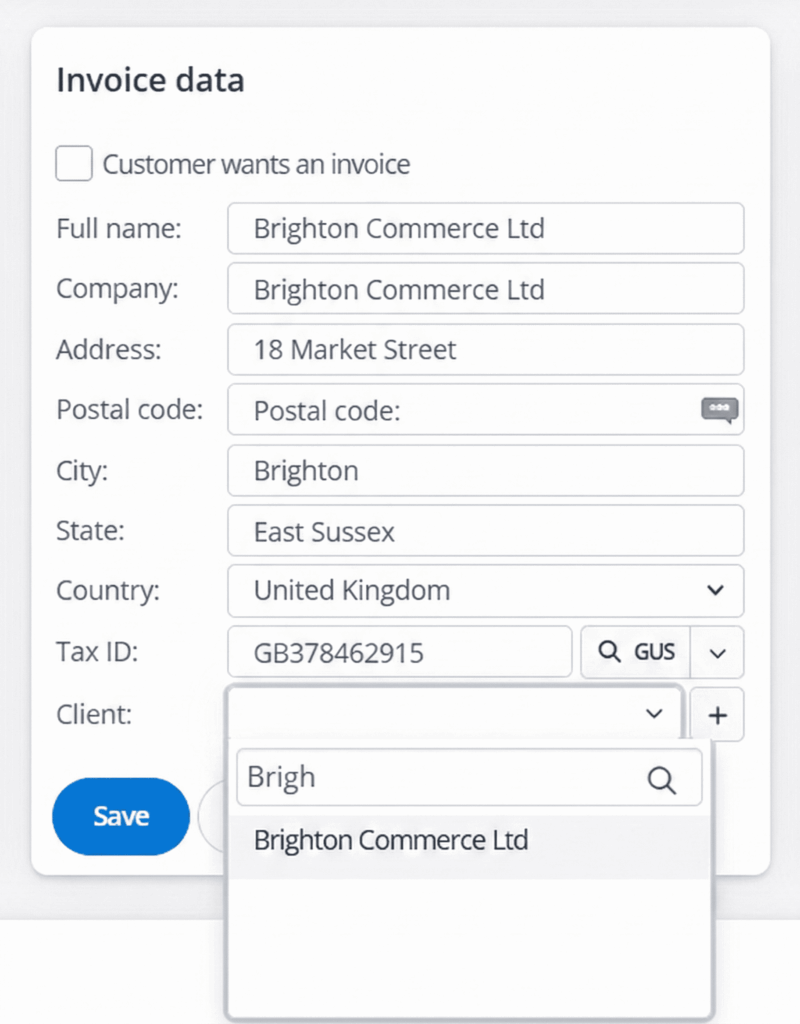 In this case, the invoice data will be permanently overwritten with the information stored on the customer card. Once you connect an order to a specific customer, all future orders will automatically be linked to the same client ID.