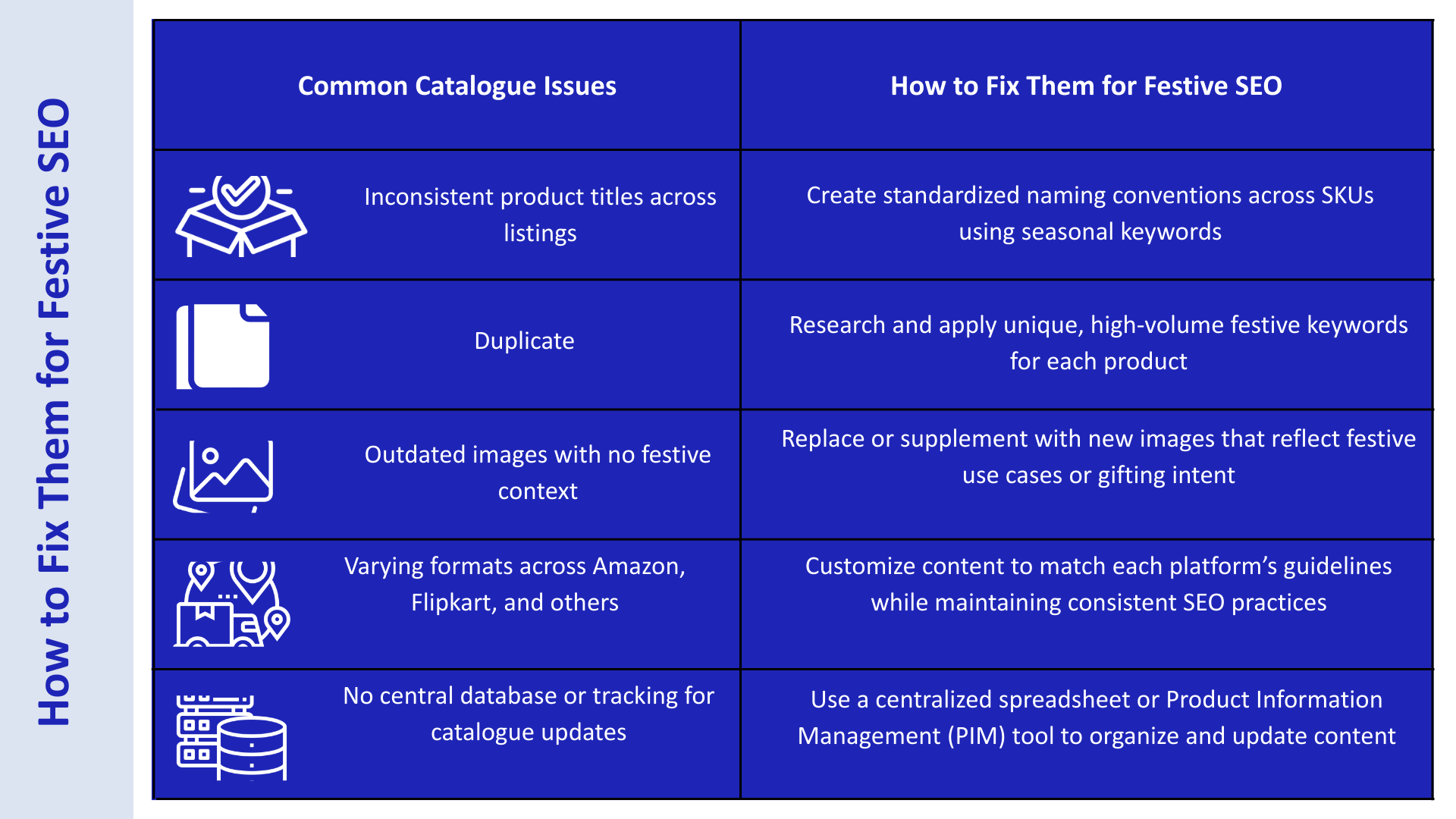 Fragmentation happens when your product data is scattered, inconsistent, or only partially updated across platforms. Some listings might include festive keywords while others do not. Some may feature fresh images, while others are still showing outdated packshots. This lack of uniformity prevents your listings from being properly optimized for festive SEO, which directly affects search rankings and conversion rates.