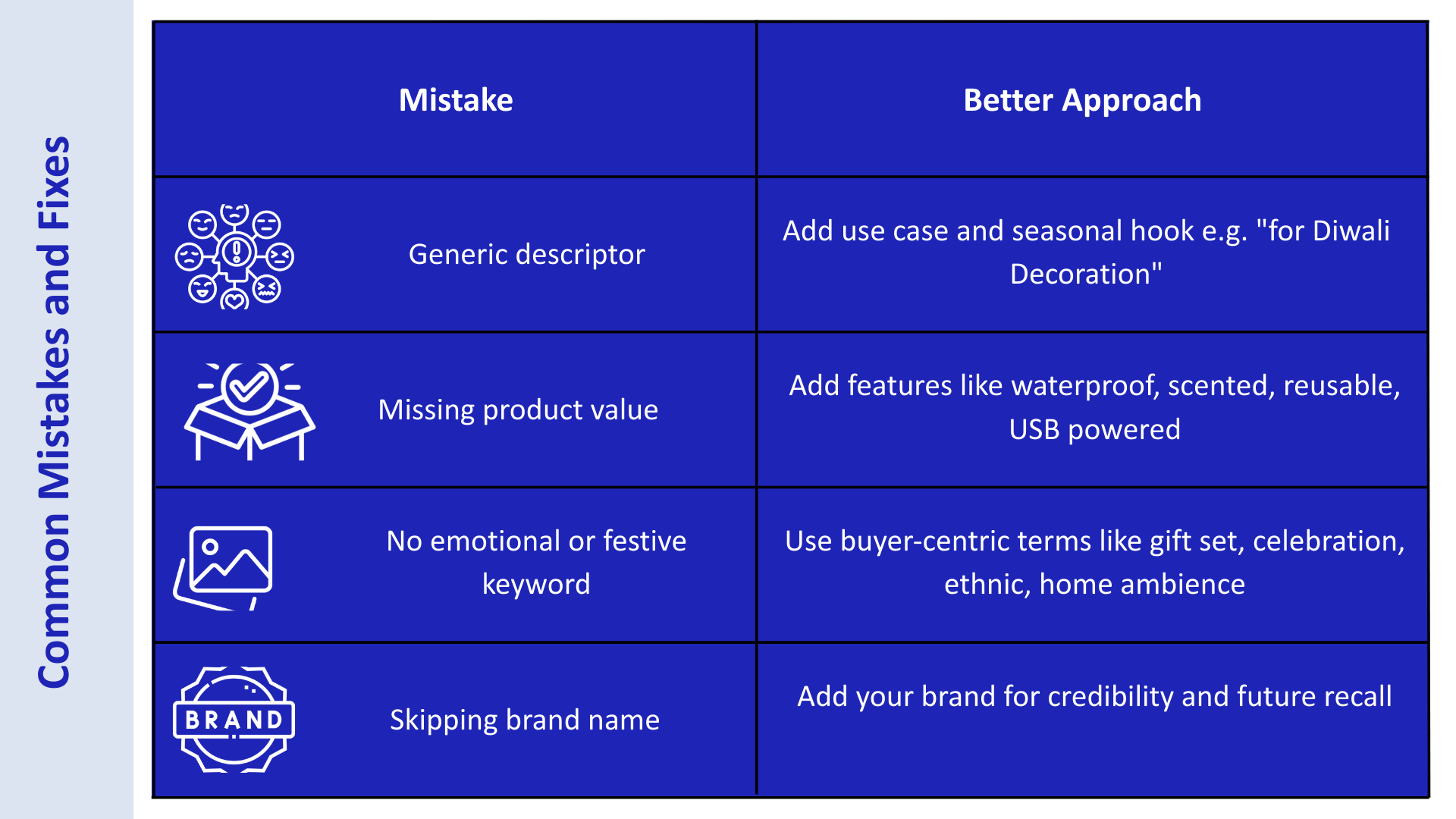 Many sellers either keep titles too generic or stuff them with too many keywords, making them hard to read. A title like “LED Light 10m Diwali Decoration Festival String for Home Office Gift Buy Now” looks messy, lacks structure, and turns buyers away. On the other hand, a title like “LED Light String” is too broad and doesn’t show festive relevance.