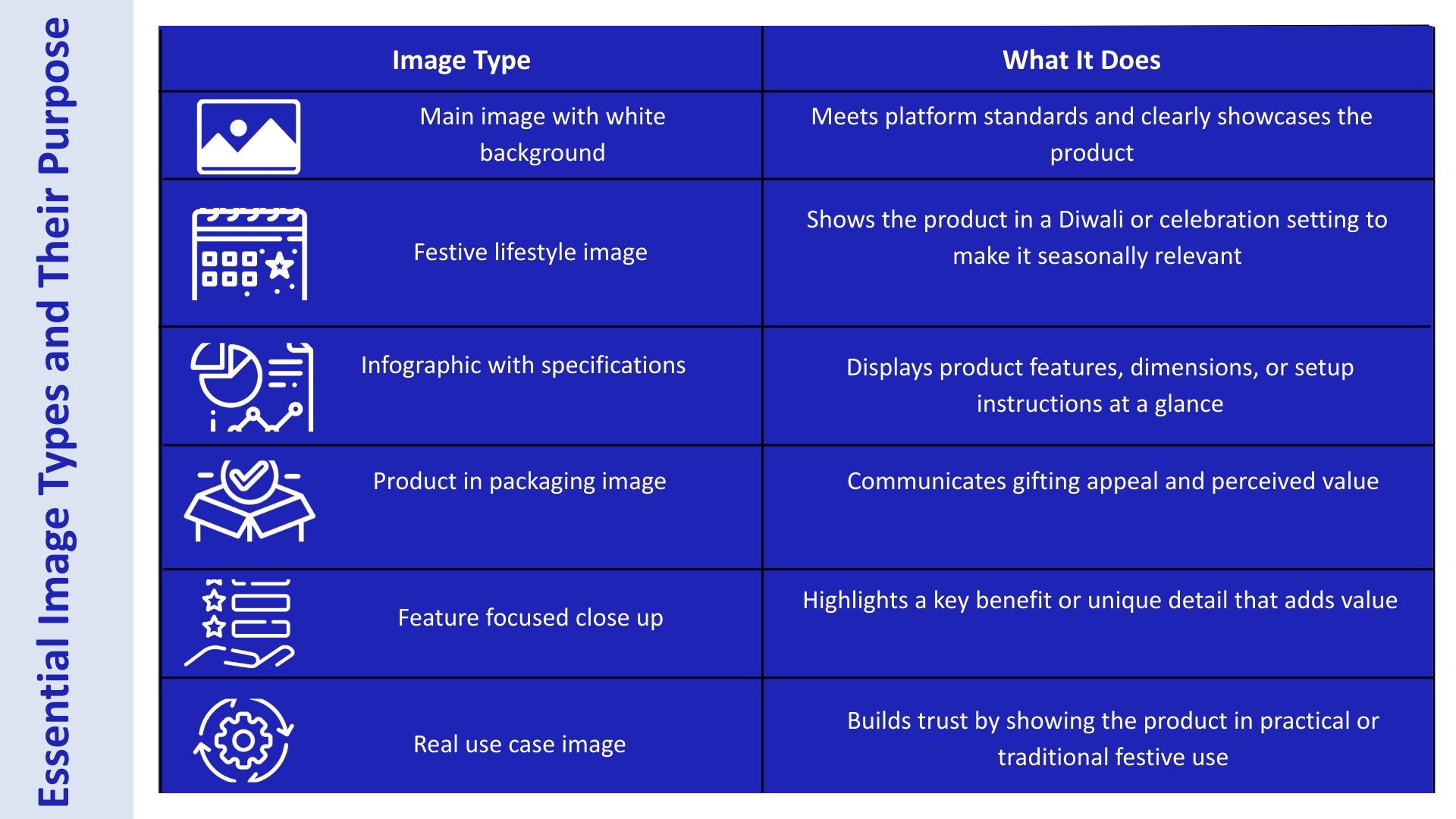 Your product images play a critical role in driving clicks and conversions during the festive season. Platforms like Amazon and Flipkart prioritize listings that perform well in both areas. Better images mean better engagement, which improves your ranking during high traffic festive sales events.
