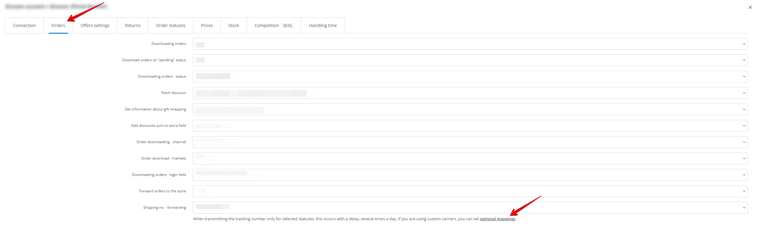 - Order statuses – here you can activate the transfer of order statuses to Amazon and set their links. Based on the statuses in BaseLinker, on Amazon, the statuses can be set to: Cancelled;