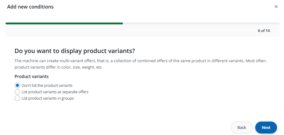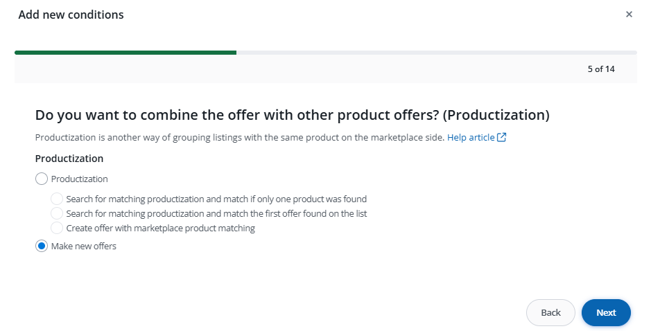 - If productization is available for a given marketplace, we can choose whether we want to create a new product on the marketplace side or connect to already created products.
