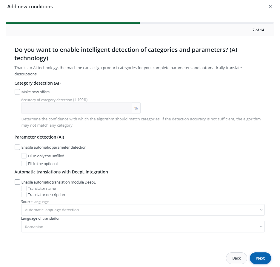 7. Here, we can choose to have the category and parameters on the listing form filled in using AI. What’s more, if we have DeepL integration connected, we can use it to translate offers.