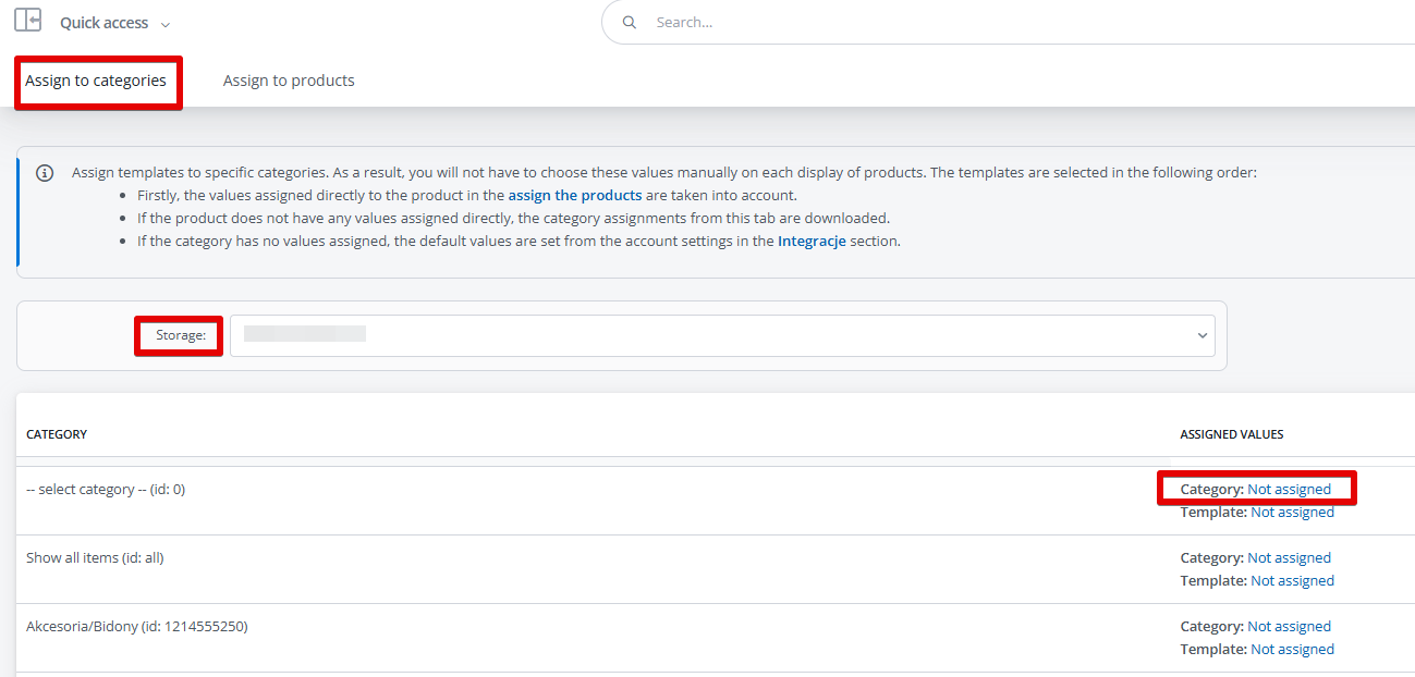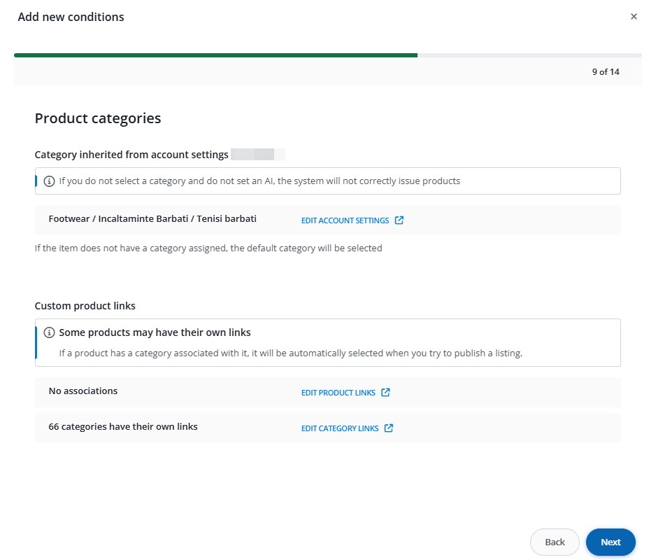 9. Here you will find information about the default category assigned to your marketplace account, as well as to categories and products. If you do not complete the category using AI, it is necessary to create category links so that it is automatically substituted.