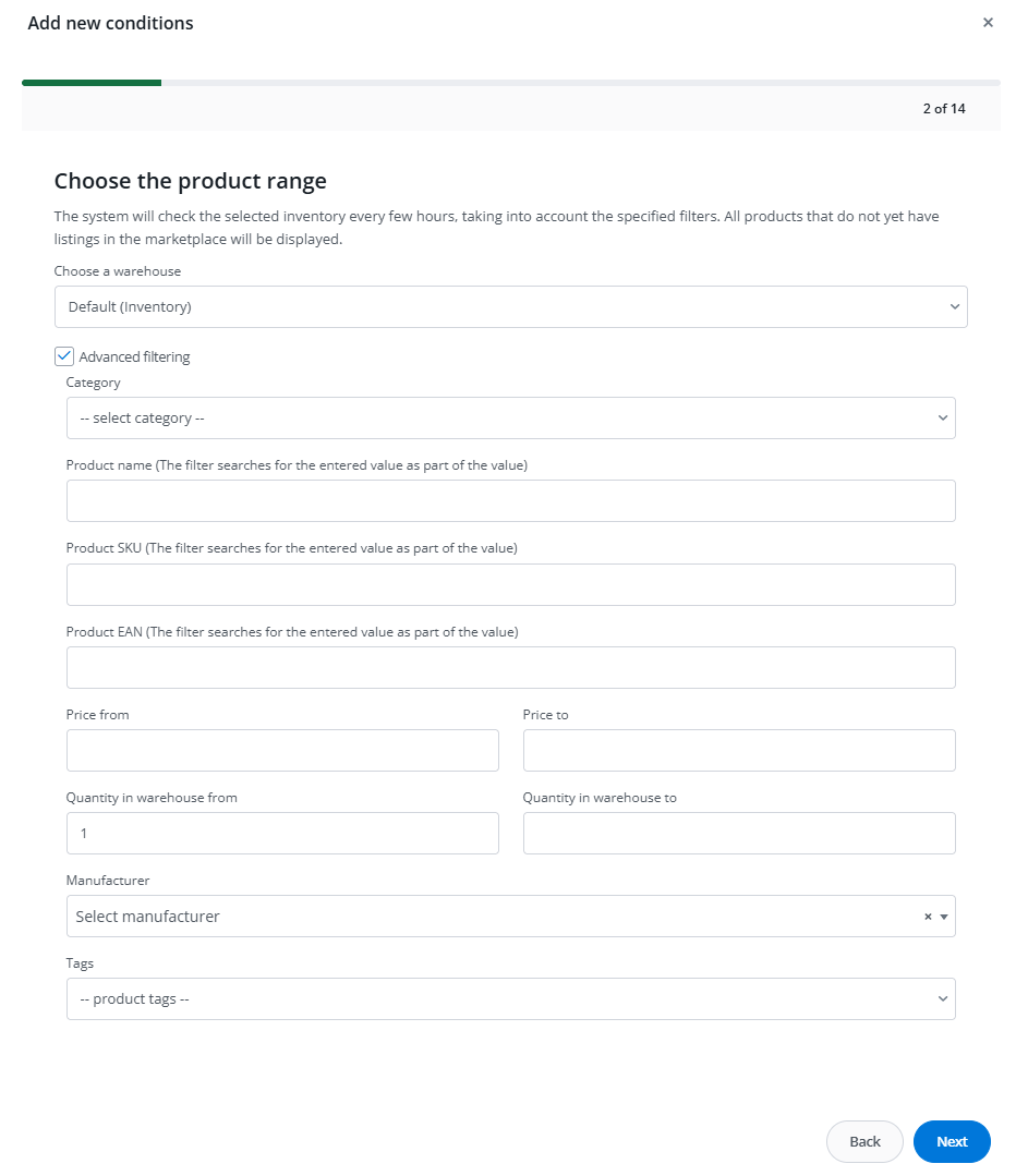 - Select the catalog from which new products will be listed. If you assign unique EAN codes to your products and they are only available in the Base.com warehouse, and not in the warehouse of, for example, your online store, when selecting the automatic product listing settings, you should select the Base.com inventory as the product source.In this tab, you can also use advanced filtering to list only products that meet specific conditions.
