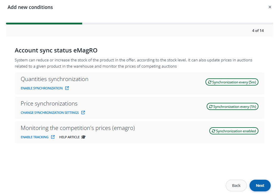 - The settings for status and price synchronization, as well as the competition module, will be applied in accordance with those set in the integration settings.