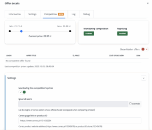 Go to: Ceneo → Offer management → Offer details → Competition tab → Settings.