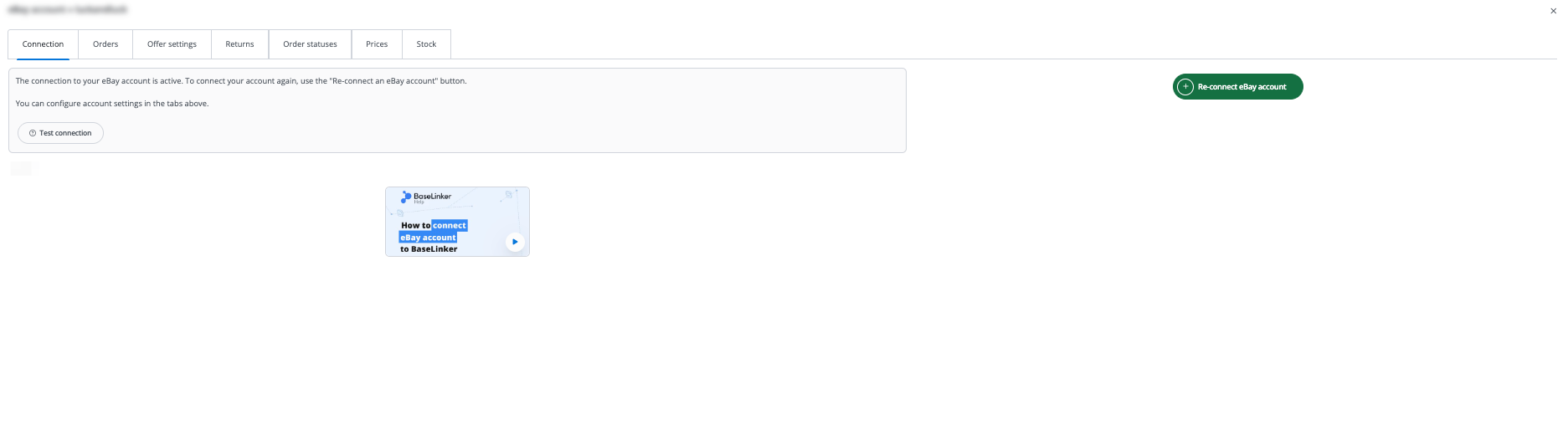 - Connection – here you can test if the connection is correct. If it was interrupted (e.g. when you changed your eBay account password), all you have to do is to select the green button ‘Reconnect eBay account’. Do not delete the current connection! If you do, you will delete entire configuration of the module.