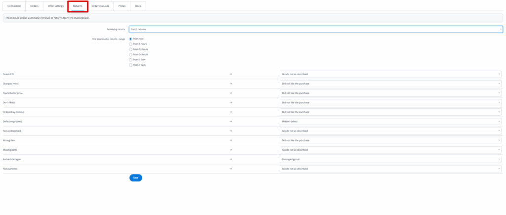 - Returns – here you can enable downloading returns from eBay to the Base.com panel