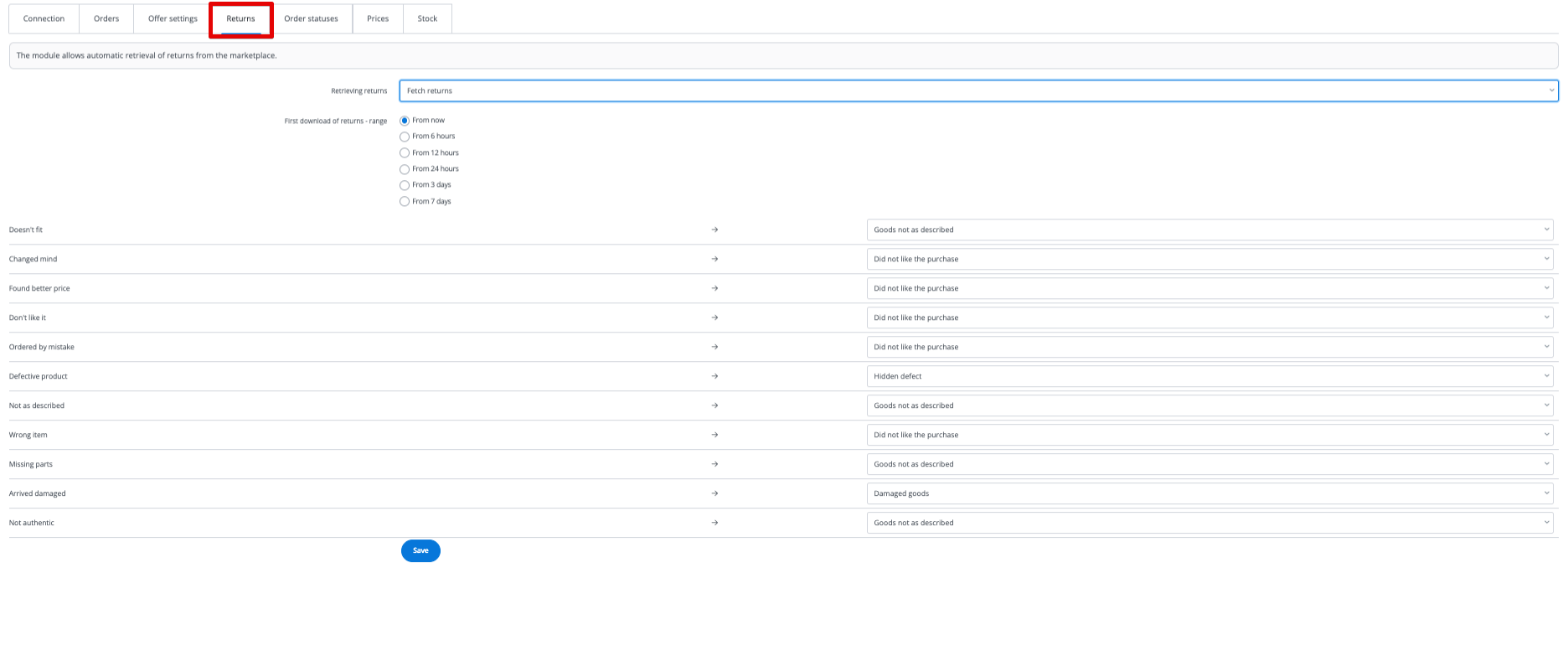 Enabling the fetching of returns is possible in the Returns tab within the eBay integration settings.