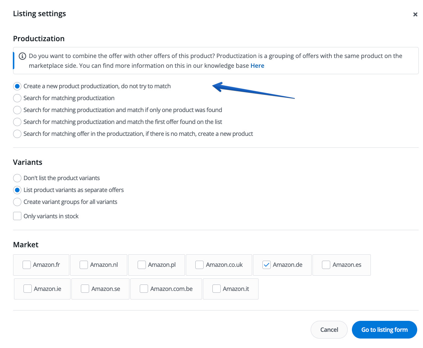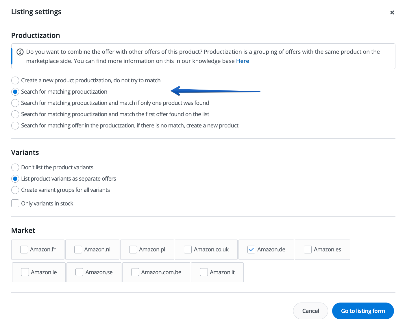 - Don’t search for matching offers (they will be matched manually) – in the listing form, it will be possible to manually search for offers. The listing form will also allow changing the listing type and creating a new product on Amazon.