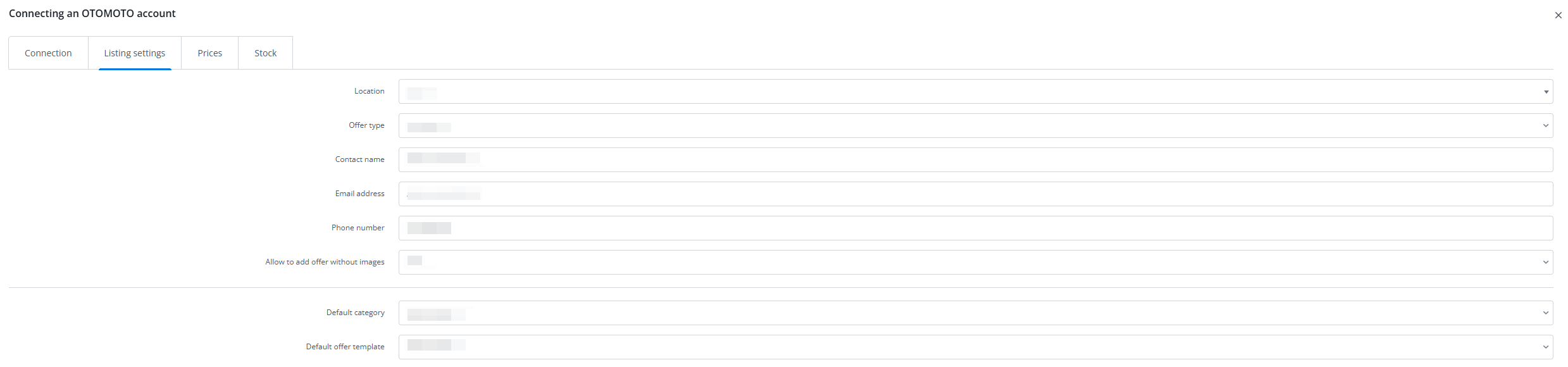 - Complete the listing settings in the Integrations → OtoMoto → Listing settings section. Here you can complete the default form settings.