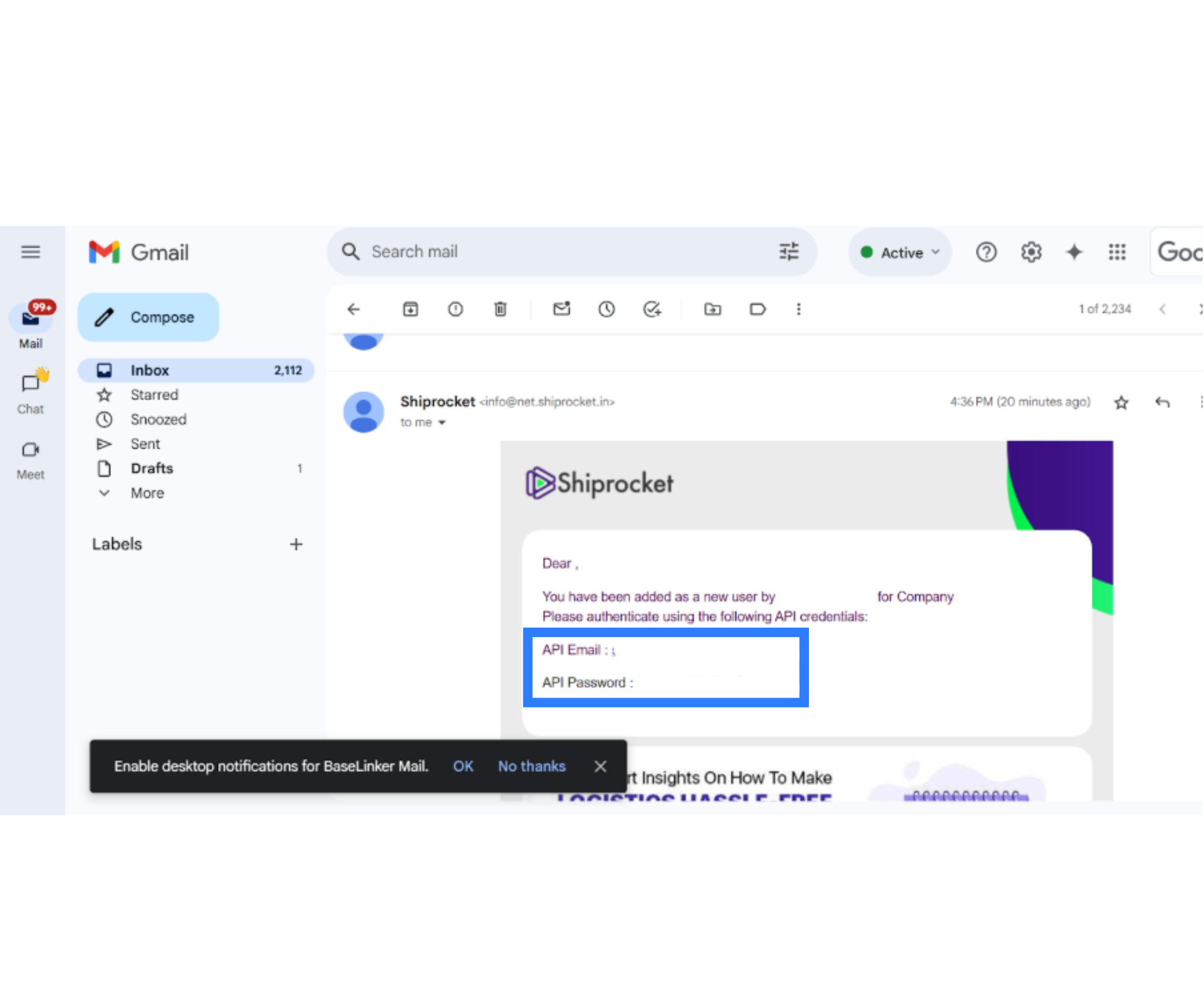 Once you create the API user, Shiprocket’s system generates a secure password that is sent to the registered admin email address. This password, along with the new API email, will be used to authenticate the connection between Shiprocket and Base.