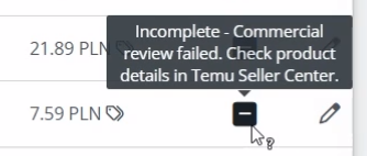 When the offer is first listed, Temu may accept or reject the price at which we want to list the product. If the price we propose is rejected, the marketplace offer will be deactivated and the message “Incomplete – Commercial review failed. Check product details in Temu Seller Center” will appear next to it: