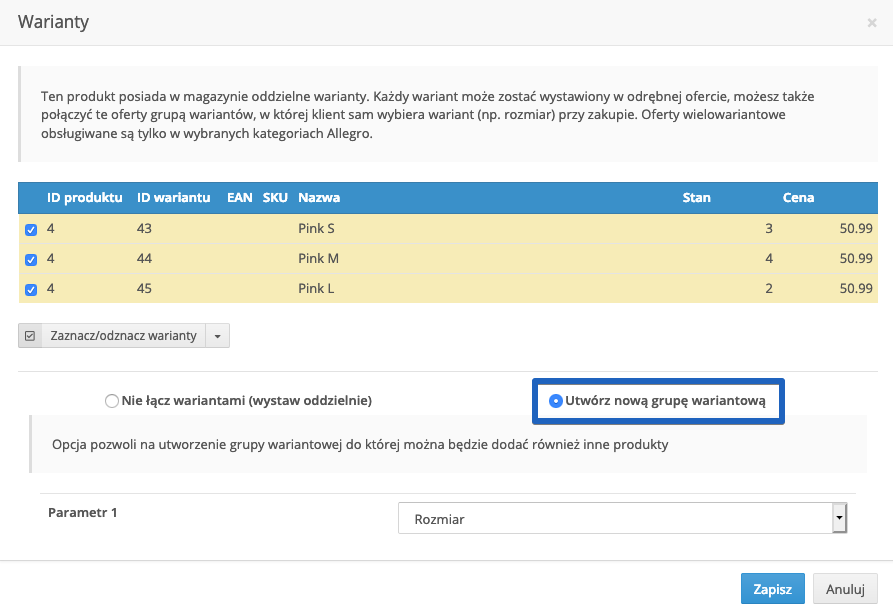 • Co w przypadku, gdy dana kategoria nie obsługuje wariantów "W tej kategorii nie ma możliwości wystawiania wariantów." W magazynie produkty widnieją jako osobne pozycje, a finalnie chciałbym je połączyć w wielowariantowość (oczywiście przez baselinker), czy jest na to jakieś rozwiązanie?