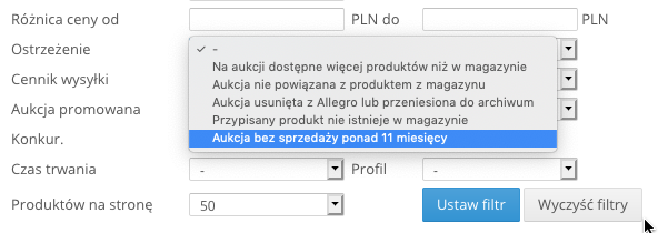 Możliwe jest wyszukanie aukcji z tym ostrzeżeniem, a następnie łatwe zamknięcie ich poprzez grupowe operacje. Po zamknięciu system pozwoli także na szybkie wznowienie tych aukcji z nowym numerem. Wyszukiwarka umożliwia teraz także wyszukanie aukcji wg ostatniej daty sprzedaży.