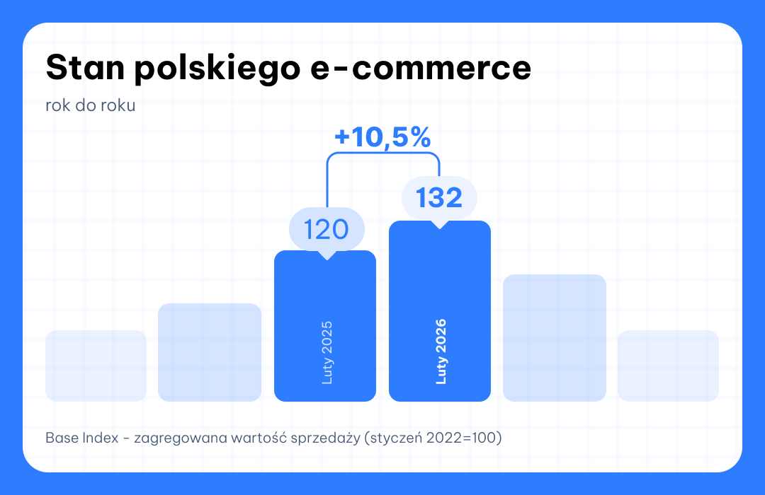 Zacznijmy od perspektywy rocznej, bo to ona najlepiej oddaje realny kierunek, w jakim zmierza branża. W porównaniu z lutym 2025 roku tegoroczny odczyt na poziomie 132 punktów oznacza wzrost o 10,5%. Co ciekawe, to dokładnie taka sama dynamika, jaką odnotowaliśmy miesiąc wcześniej w styczniu. Polski e-commerce rośnie więc w stabilnym, dwucyfrowym tempie – i to jest najlepsza wiadomość tego odczytu. Przeanalizujmy to głębiej: