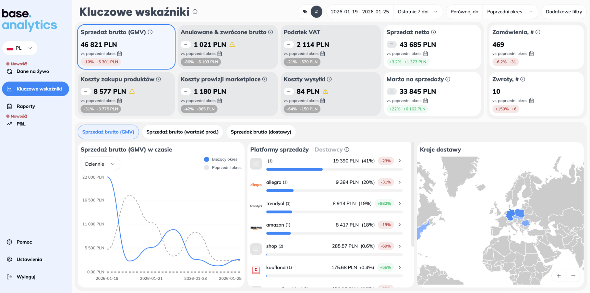 Wiele rozwiązań kończy się na ogólnych wykresach i sumach. W Base Analytics patrzysz szerzej: w jednym miejscu zestawiasz nie tylko wyniki sprzedaży, ale także koszty zakupu towaru, prowizje marketplace’ów, zwroty oraz realną marżę brutto z każdego kanału sprzedaży.