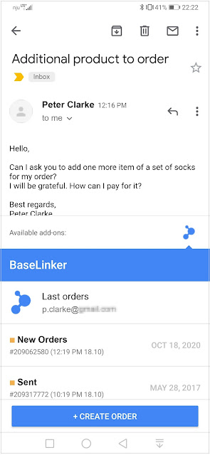 Naszą ofertę wzbogaciliśmy o praktyczną aplikację dla sprzedawców, korzystających ze skrzynki pocztowej Gmail. BaseLinker w Gmail to bezpłatny dodatek do poczty Gmail, który bezpośrednio w widoku skrzynki pocztowej pokazuje zamówienia klienta powiązane z danym adresem e-mail. Umożliwia przejście jednym kliknięciem do właściwej karty zamówienia w systemie BaseLinker. Z dodatku można korzystać zarówno na komputerze, jak i na telefonie komórkowym. Dodatek osadzony jest w interfejsie Gmail i funkcjonuje jako oficjalne rozszerzenie Gmail.