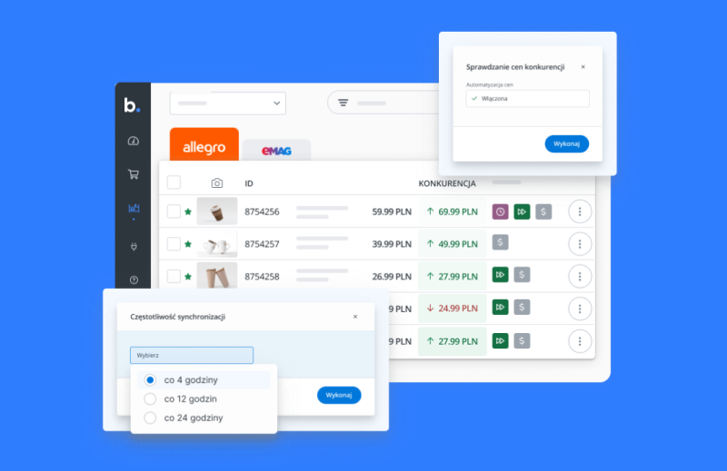W praktyce ceny konkurencji można monitorować bezpośrednio w panelu Base, który automatycznie zbiera i porządkuje dane z marketplace’ów takich jak Allegro, Amazon, eBay, Kaufland oraz wielu innych platform w Polsce i za granicą. Bez ręcznego sprawdzania każdej oferty.