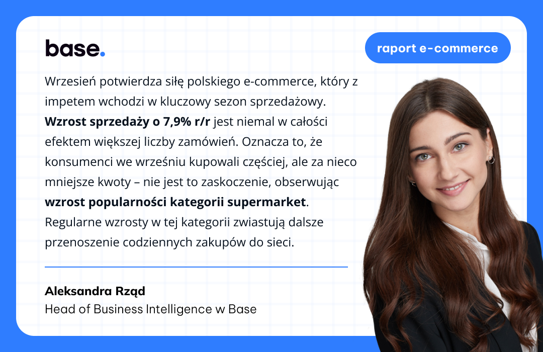 W ujęciu miesiąc do miesiąca najsilniej urosła kategoria supermarket. To logiczna kontynuacja trendu z ostatnich kwartałów: klienci coraz chętniej robią codzienne zakupy w sieci. Wzrost tej kategorii wyjaśnia też spadek średniego koszyka — więcej zakupów na bieżąco, mniej jednorazowych dużych transakcji. Jak słusznie zauważa Aleksandra Rząd, Head of Business Intelligence w Base: Regularne wzrosty w tej kategorii zwiastują dalsze przenoszenie codziennych zakupów do sieci.