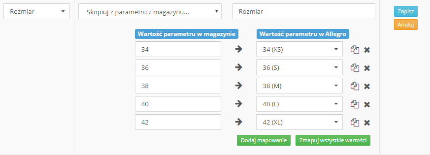 2. Przyporządkowanie wartości parametrów Allegro wartościom parametrów w magazynie, np. parametr w sklepie „Rozmiar” o wartości „36” ma odpowiadać parametrowi „Rozmiar” o wartości „36 (S)” na Allegro.