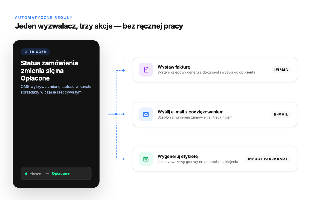 Tworzysz reguły, które system wykonuje za Ciebie. Przykładowo: jeśli zamówienie opłacone → wyślij e-mail z potwierdzeniem → zamów kuriera → zmień status. To eliminuje ręczne klikanie i pozwala obsłużyć setki zamówień dziennie bez zwiększania zespołu.