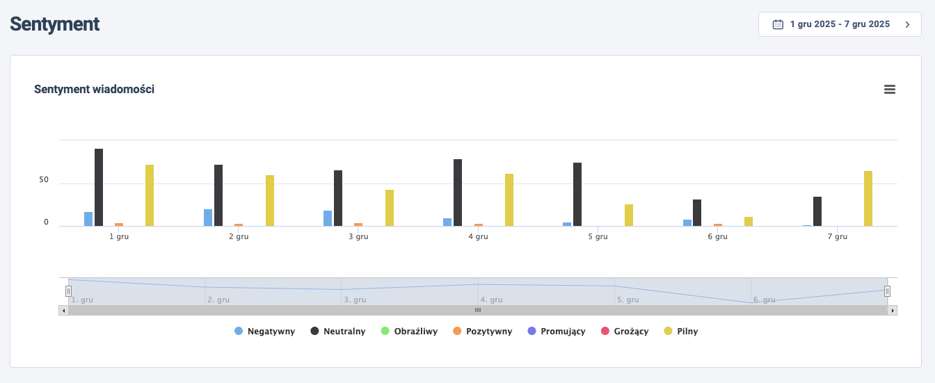Raport sentymentów obrazuje, jak zmienia się nasycenie emocjonalne komunikacji w czasie.
