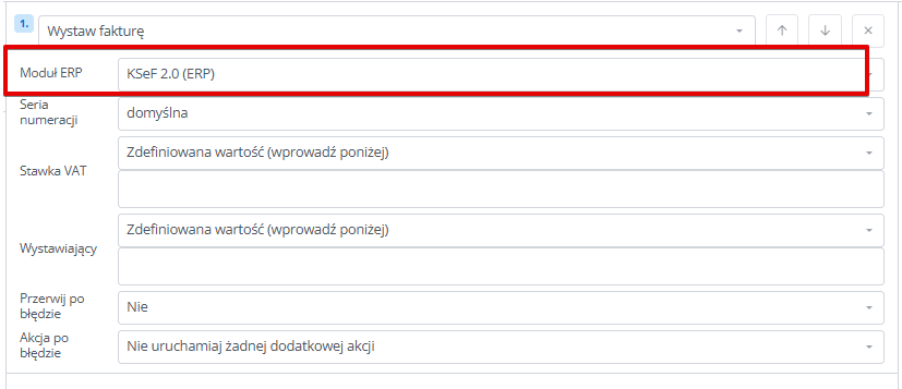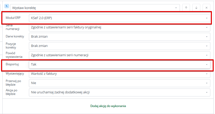 W przypadku tej akcji konieczne jest wskazanie KSeF jako modułu ERP.
