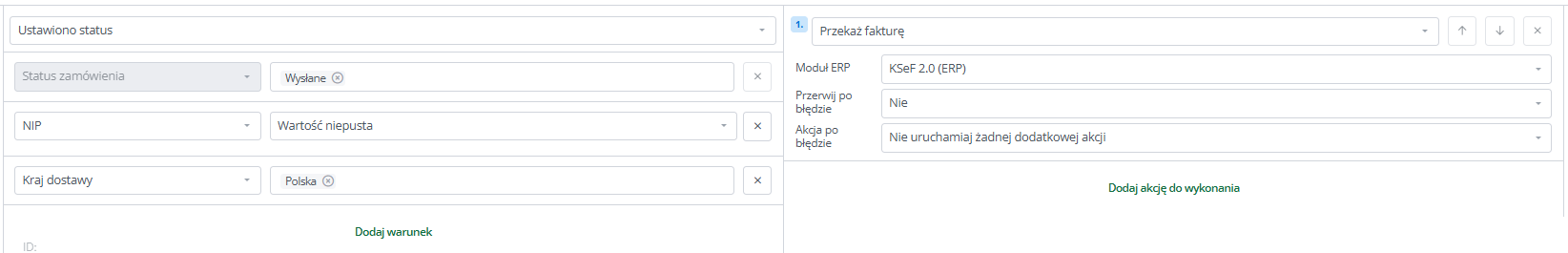 Uwaga! Ustawienia automatycznej akcji są nadrzędne nad ustawieniami w integracji. Jeśli utworzysz akcję, która ma przekazać fakturę z danej serii do KSeF, a ta seria jest wykluczona w ogólnej konfiguracji integracji, faktura i tak zostanie przekazana.