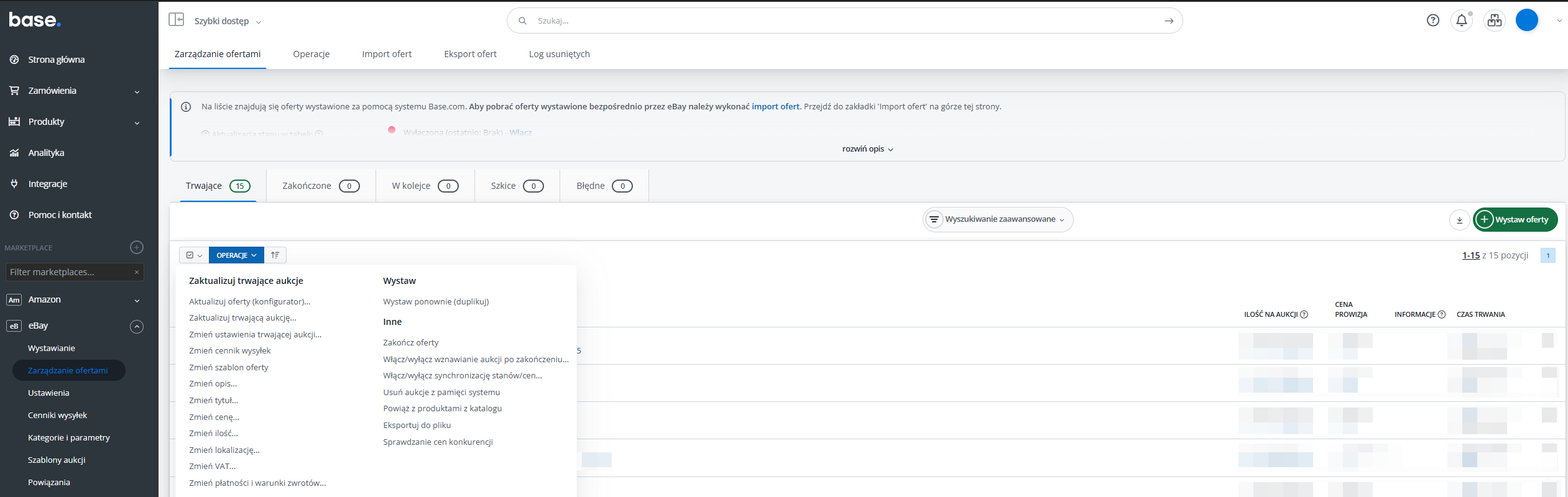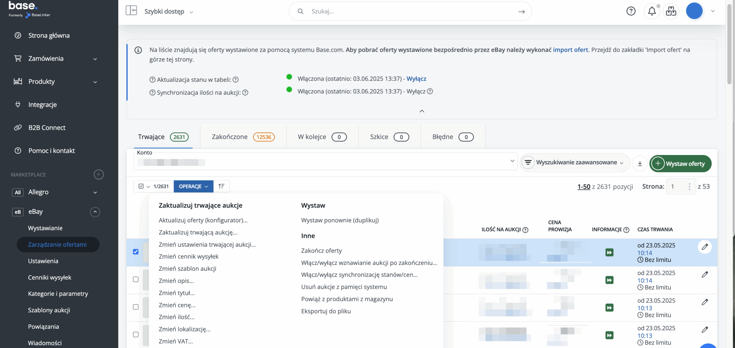 Base.com umożliwia masową aktualizację aukcji eBay. Wszystkie dostępne opcje znajdziesz w dziale eBay → Zarządzanie aukcjami → Operacje. W tym miejscu możesz np. zmienić przypisany do aukcji cennik, szablon itp.