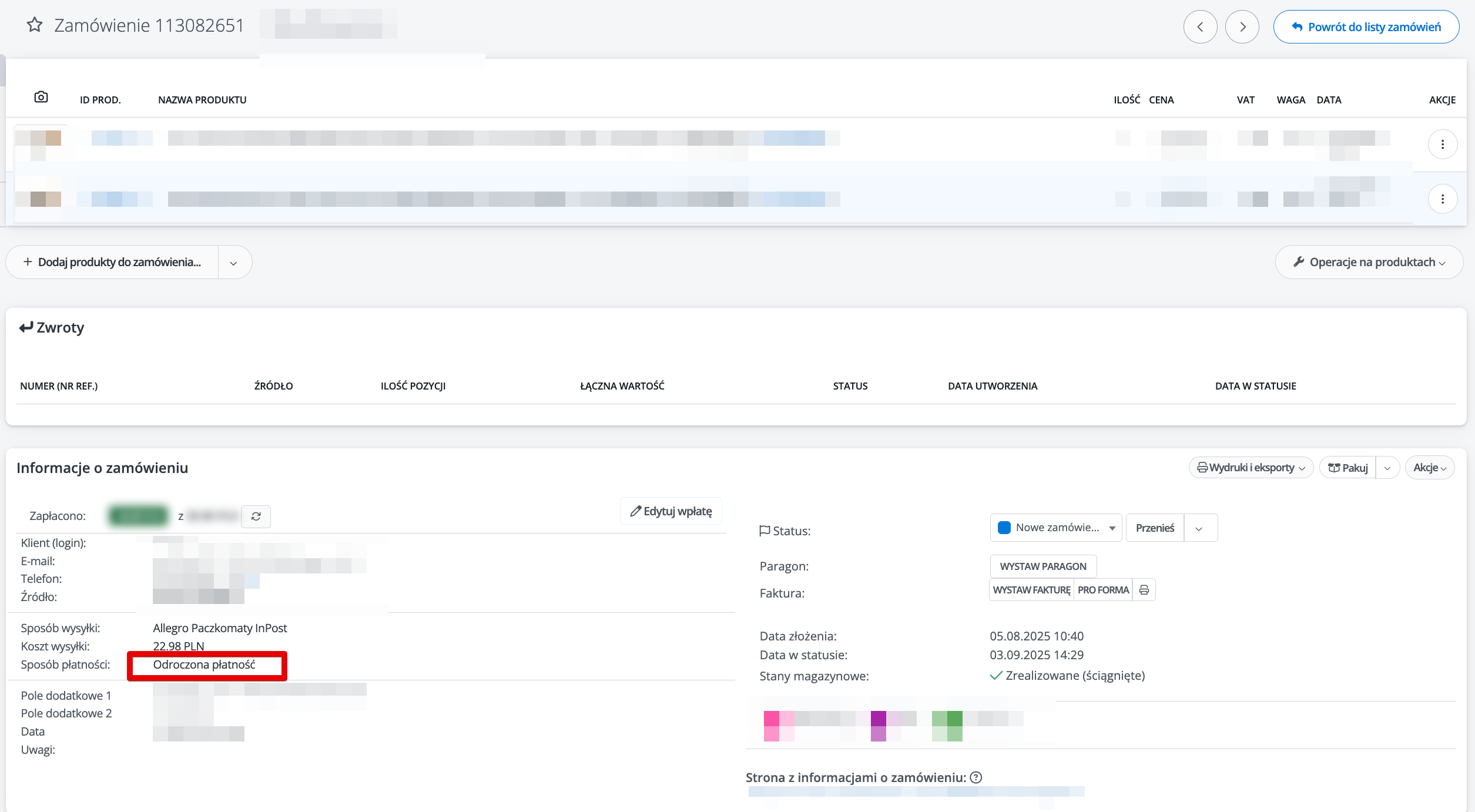 Informacja o wybranej formie płatności znajduje się na karcie zamówienia (Informacje o zamówieniu → Sposób płatności → Odroczona płatność).