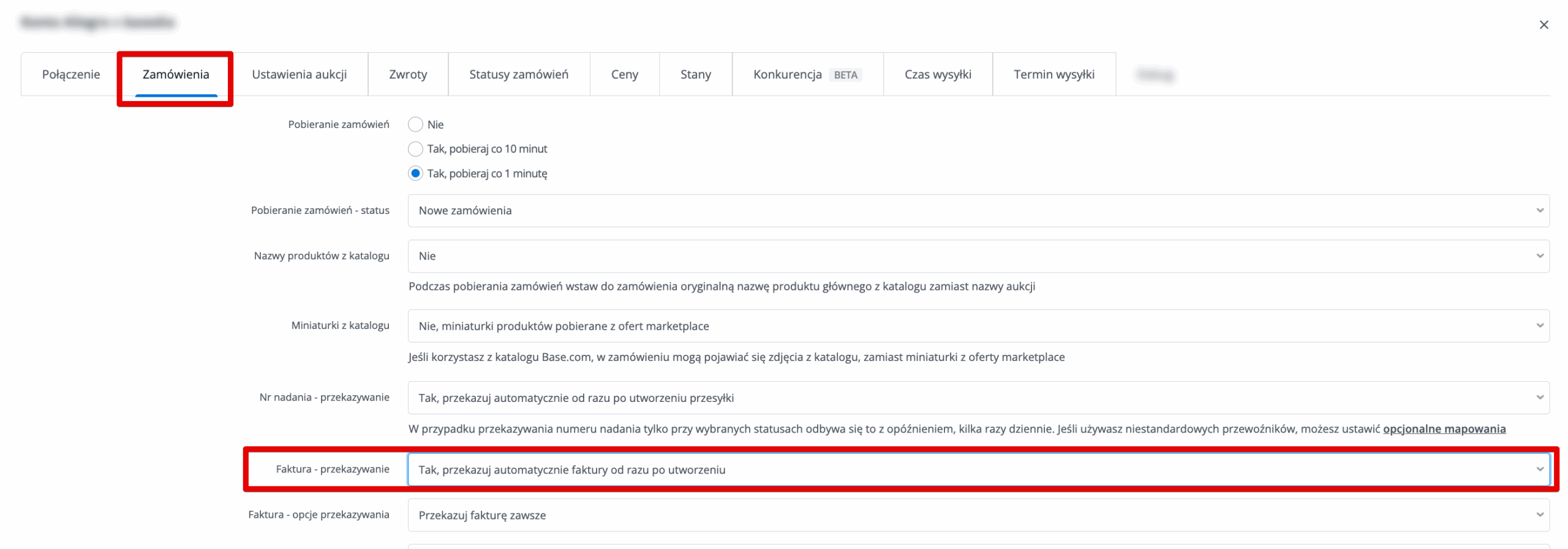 Z poziomu panelu Base.com istotne jest, aby włączyć opcję przekazywania faktur (Integracje → Allegro → Ustawienia → Zamówienia → Faktura – przekazywanie → Tak).