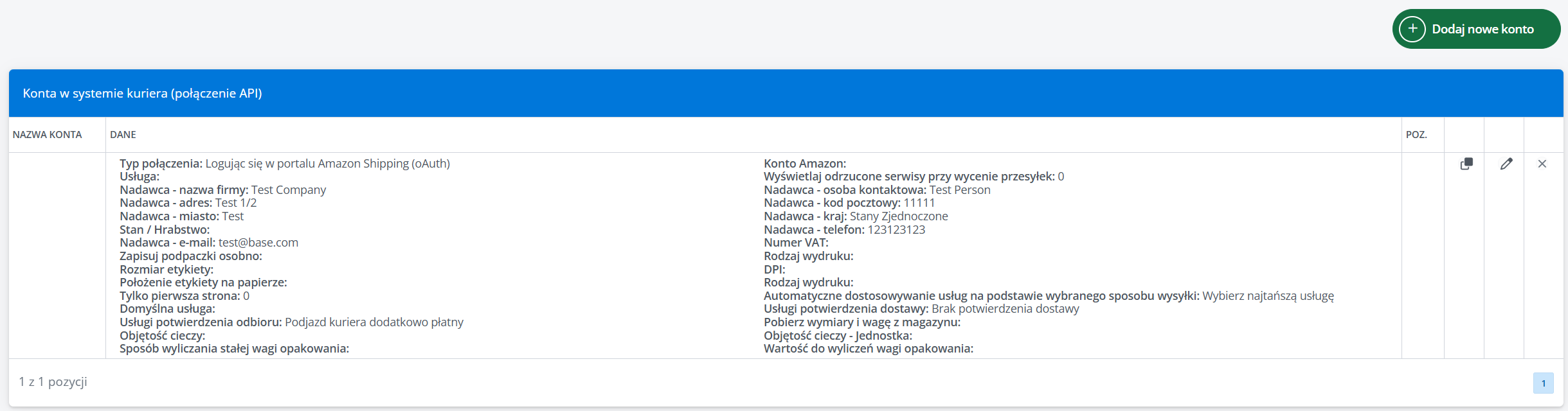 W tej sekcji dostępna jest lista wszystkich podpiętych do systemu kont kuriera. Jeśli posiadasz ich więcej niż jedno, możesz zmieniać ich pozycje za pomocą strzałek z prawej strony tabeli. Możliwe jest również klonowanie, edycja oraz usunięcie każdego z kont.