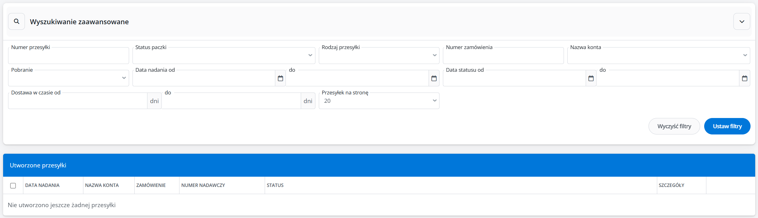Utworzone przesyłki