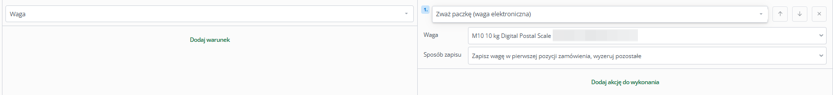 - Brak – odczyt wagi możliwy będzie za pomocą akcji automatycznej (akcja);