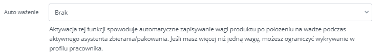 Aby waga była odczytywana za pomocą zdarzenia własnego (np. po naciśnięciu przycisku dostępnego na karcie zamówienia i/lub w Asystencie Pakowania), wybierz opcję Brak dla ustawienia Auto ważenie i utwórz automatyzację wykonującą akcję Zważ paczkę (waga elektroniczna).