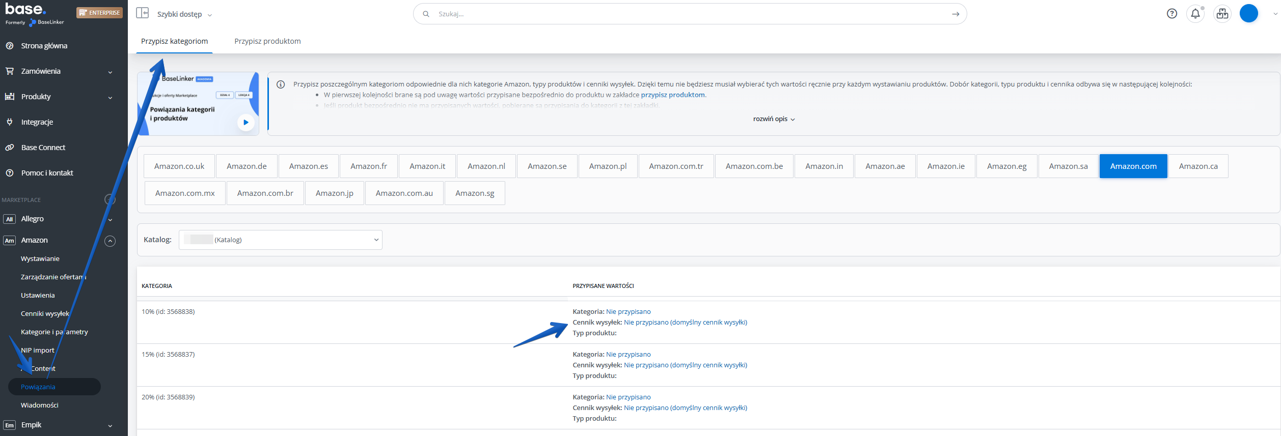 - dla wybranych kategorii w magazynie skonfigurujesz w dziale Amazon → Powiązania → Przypisz kategoriom