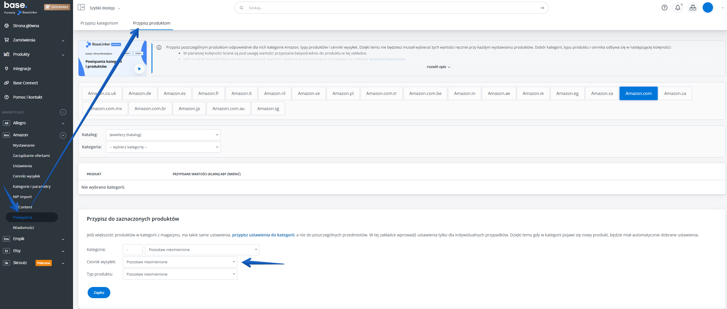 - Domyślny cennik wysyłek dla konkretnych produktów skonfigurujesz w dziale Amazon → Powiązania → Przypisz produktom