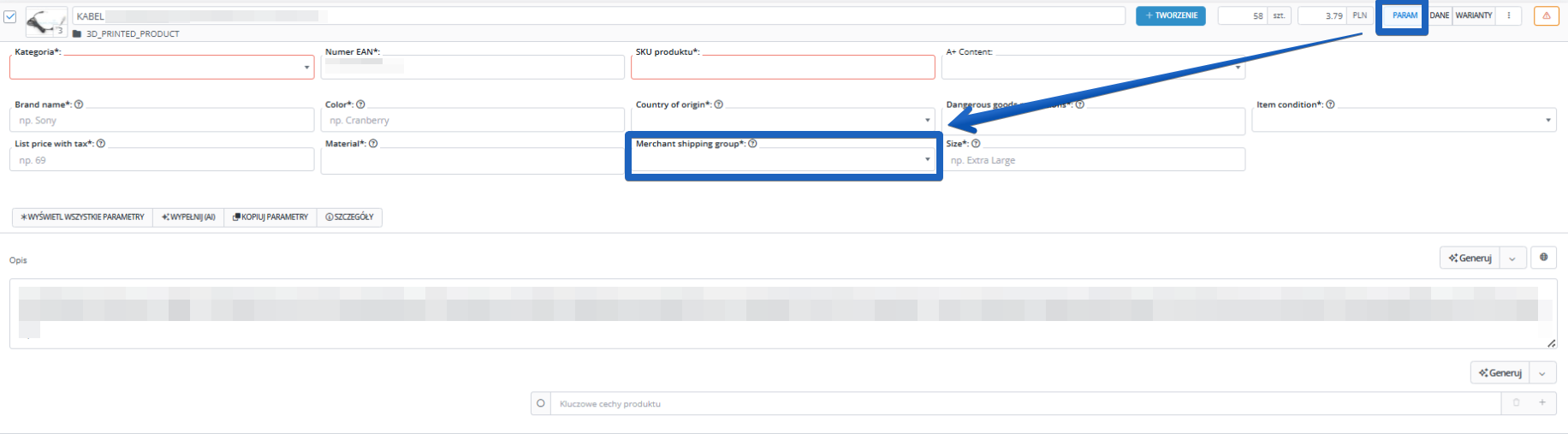 - Cennik możesz także ręcznie wybrać z listy podczas wystawiania oferty. Po wyborze typu produktu w zakładce Parametry → Merchant shipping group