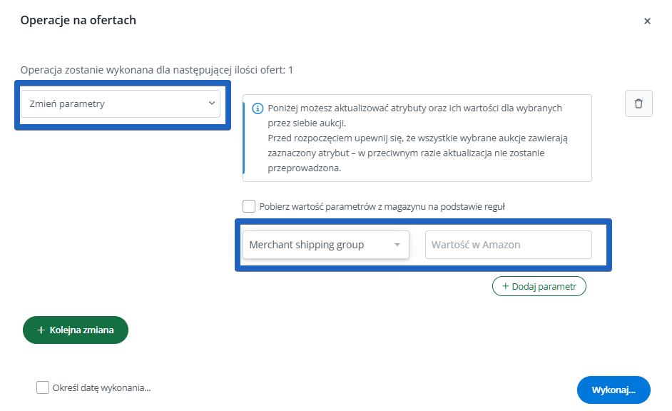Dla wystawionych ofert również jest możliwość zaktualizowania przypisanego cennika. Zrobisz to za pomocą masowych operacji -> Aktualizuj oferty (konfigurator) – Zmień parametr -> Merchant shipping group wpisując odpowiedni identyfikator cennika.